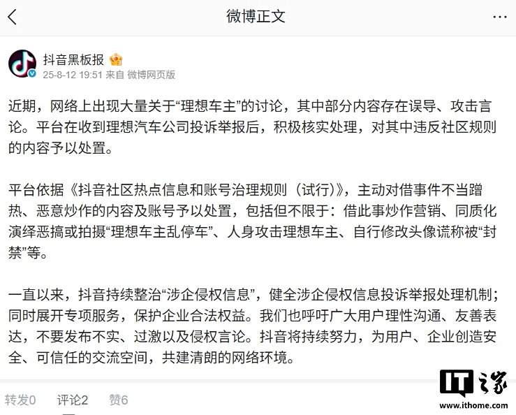 IT之家 8 月 12 日消息,抖音刚刚发布公告,宣布对网上关于“理想车主”部分误导、攻击言论进行处理。IT之家附原文如下: